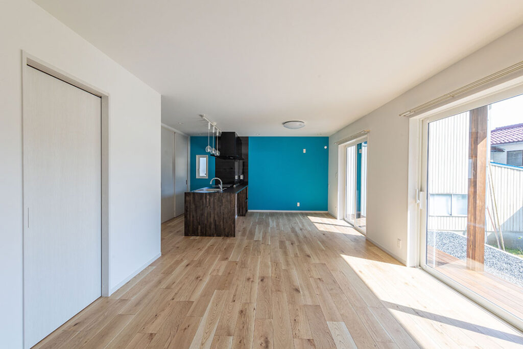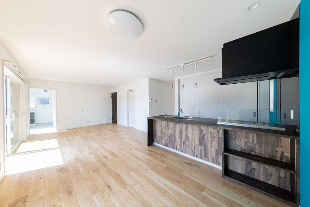 LDKは一体空間に。奥に見えるのが洗面室
