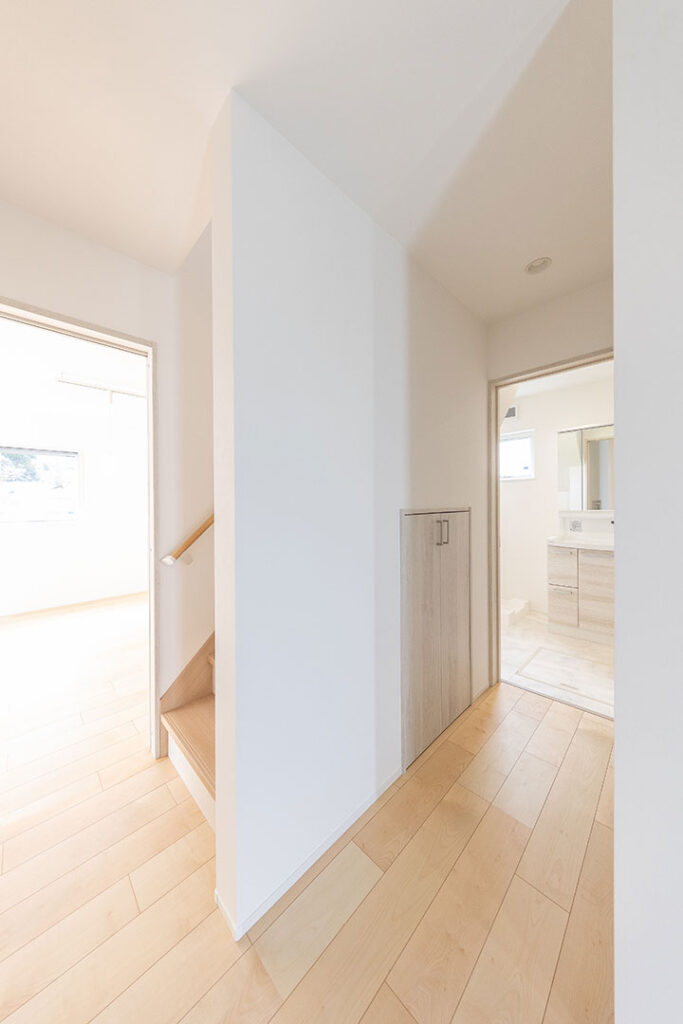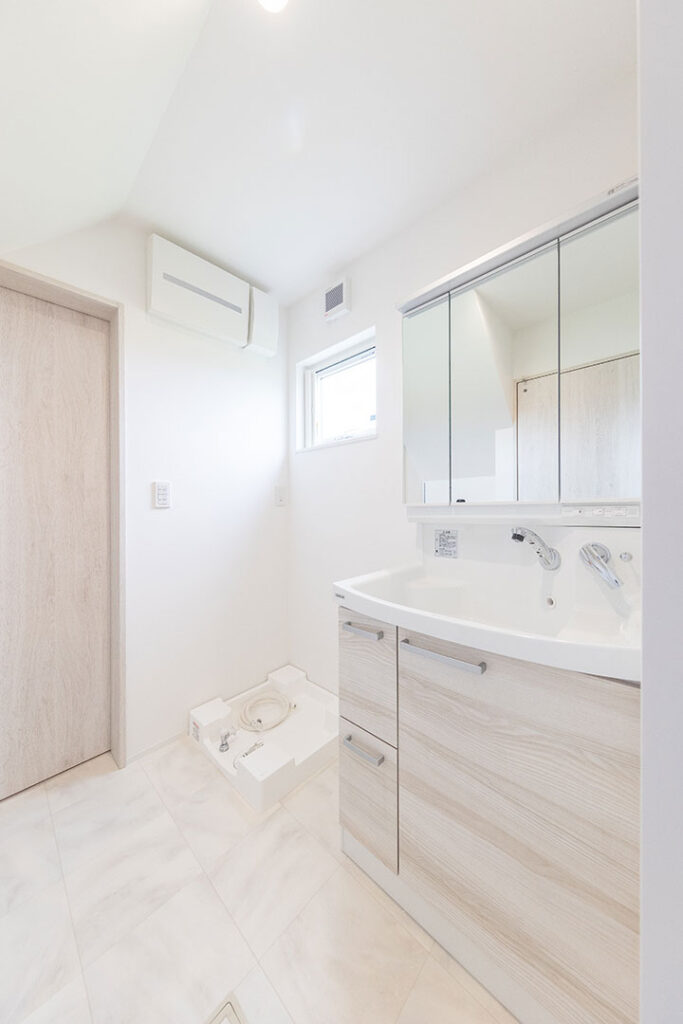 玄関→洗面所→キッチン→リビングの回遊動線になる間取りがこだわりです。